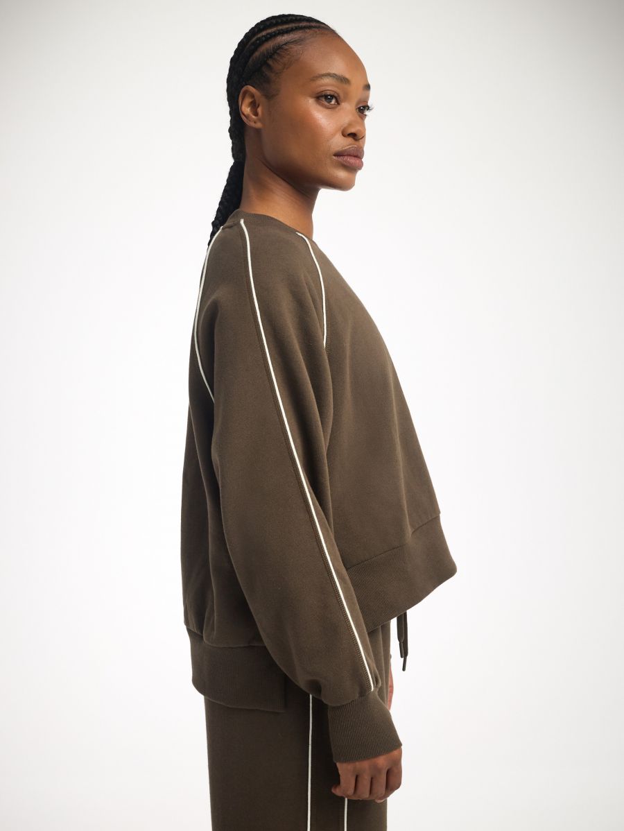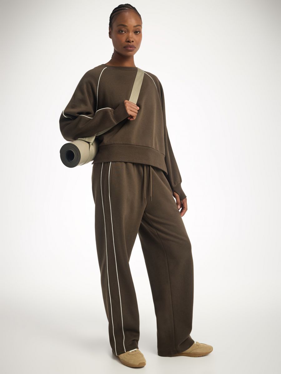 מכנסי טרנינג בגזרה ישרה ונינוחה, בד רך ונעים, ועיצוב עם פסים לאורך הרגל לסטייל מדויק ועדכני. גומי במותן עם שרוך התאמה וכיסים לנוחות. שלבי עם מכנסי הטרנינג התואמים.